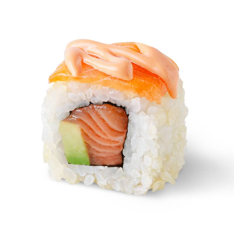 Roll con Salmone Crudo e avocado, ricoperto di Salmone e Fiocchi di tempura