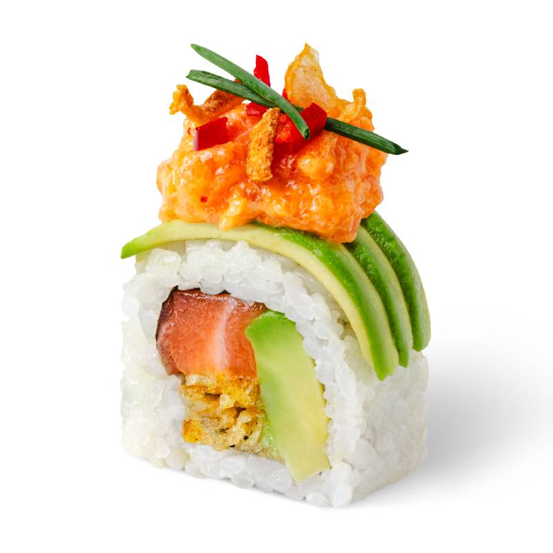 All’esterno: Avocado, tartare di salmone spicy, peperoncino dolce, erba cipollina e cipolla crispy.